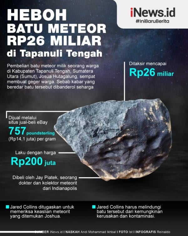 JAKARTA, iNews.id - Penjualan meteor hitam yang jatuh di rumah salah satu warga Desa Satahi Nauli, Kabupaten Tapanuli Tengah, Sumatera Utara (Sumut) menyita perhatian publik. Benda luar angkasa tersebut telah dibeli seorang kolektor asal Amerika Serikat (AS) seharga Rp200 juta.