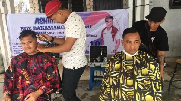 DELISERDANG, iNews.id - Caleg Perindo Dapil Sumatera Utara (Sumut) I, Boy Bakamaro Ginting, menggelar pangkas rambut gratis di posko relawan, Jalan Diponegoro No 74 Lubuk Pakam, Kabupaten Deliserdang.