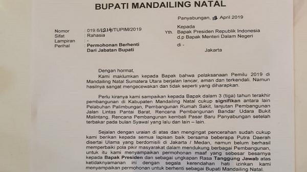 Begini Isi Surat Pengunduran Diri Bupati Madina kepada Presiden