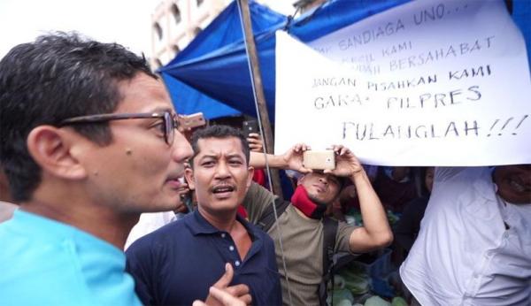 Namun, langkah Sandi terhenti saat melihat beberapa poster di tengah-tengah pasar. Poster karton putih dengan tulisan spidol dan di-straples di terpal biru itu bertuliskan “Pak Sandiaga Uno Sejak Kecil Kami Sudah Bersahabat, Jangan Pisahkan Kami Gara-gara Pilpres, Pulanglah!!!" .Satu poster lainnya memuat tulisan "#2019 Tetep Jokowi. Apapun Alasannya pilihan kami tetap Jokowi".