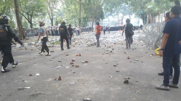 Sisa-sisa lemparan batu dalam aksi anarkistis pelajar di Medan Sumut. (Foto: iNews.id/Stepanus Purba).