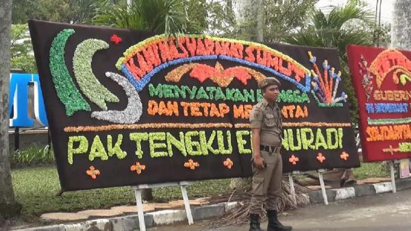 MEDAN, iNews.id – Suasana halaman Kantor Gubernur Sumatera Utara (Sumut) berbeda dari biasanya. Puluhan karangan bunga berisi kalimat dukungan untuk Gubernur Sumut Tengku Erry Nurady menghiasi kawasan menuju pintu masuk.