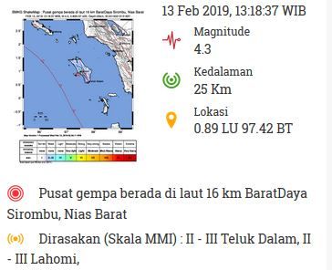 “#Gempa Mag:4.3, 13-Feb-19 13:18:37 WIB, Lok:0.89 LU, 97.42 BT (Pusat gempa berada di laut 16 km BaratDaya Sirombu, Nias Barat), Kedalaman:25 Km. Dirasakan (MMI) II - III Teluk Dalam, II - III Lahomi,” tulis @infoBMKG, akun twitter resmi BMKG, Rabu (13/2/2019).