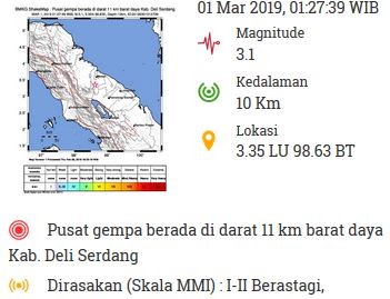 “Gempa Mag:3.1, 01/03/2019 01:27:39 (Pusat gempa di darat 11 km barat daya Kab. Deli Serdang), Kedlmn:10 Km Dirasakan (MMI) I-II Berastagi,” tulis @infoBMKG, akun twitter resmi BMKG, Jumat (1/3/2019).