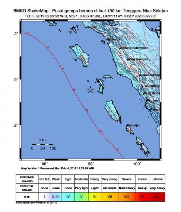 “#Gempa Mag:6.1, 05/02/2019 02:29:53 (Pusat gempa di laut 130 km Tenggara Nias Selatan), Kedlmn:11 Km Dirasakan (MMI) III Nias Selatan, III Pasaman, III Bukit Tinggi, III Padang Panjang, II Pariaman, II Padang, II Payakumbu, #BMKG,” tulis BMKG lewat akun twitter resminya, @infoBMKG, Selasa (5/2/2019).