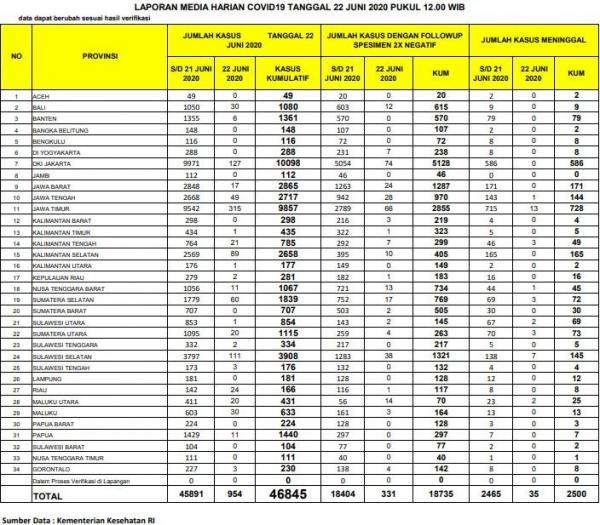 Secara nasional, update terkini Covid-19 mencatat penambahan 954 kasus baru dengan total pasien positif mencapai 46.645 orang. Selain itu juga ada penambahan 331 pasien sembuh. Jumlah total pasien yang dinyatakan sembuh hasil dua kali pemeriksaan kini mencapai 18.735 orang.