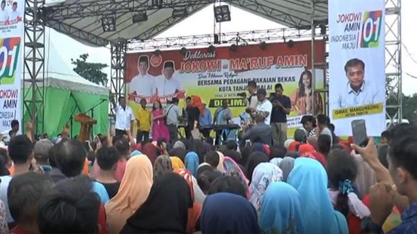 TANJUNGBALAI, iNews.id - Ribuan warga yang tergabung dalam komunitas pakaian bekas mendeklarasikan diri mendukung pasangan Joko Widodo-KH Ma’ruf Amin pada Pemilu 2019 di Jalan Teuku Umar, Kota Tanjungbalai, Sumatera Utara, Senin (21/1/2019).