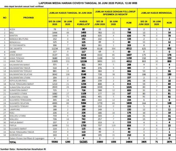 Secara nasional, update terkini Covid-19 mencatat penambahan 1.293 kasus baru dengan total pasien positif mencapai 56.385 orang. Selain itu juga ada penambahan 1.006 pasien sembuh. Total pasien yang dinyatakan sembuh hasil dua kali pemeriksaan kini mencapai 24.806 orang.