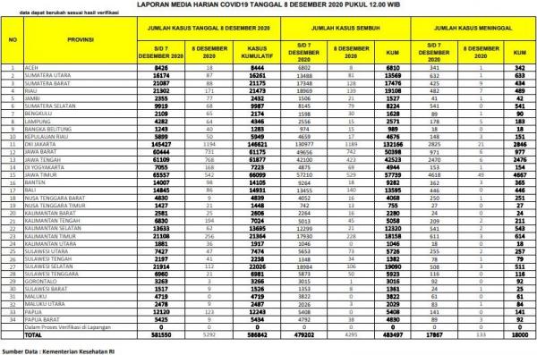 JAKARTA, iNews.id - Update terbaru jumlah warga di Sumatera Utara yang terkonfirmasi positif Covid-19 mencapai sebanyak 16.261 orang pada Selasa (8/12/2020) hari ini. Ada penambahan 87 kasus baru dari sebelumnya berjumlah 16.174 orang.