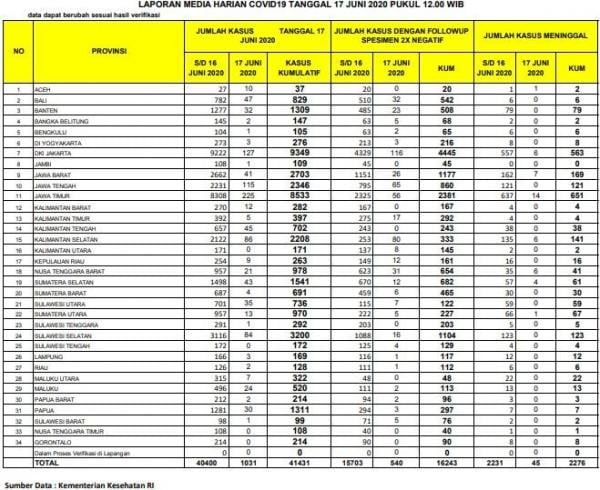 Secara nasional, update terkini Covid-19 mencatat penambahan 1.031 kasus baru dengan total pasien positif mencapai 41.431 orang. Selain itu juga ada penambahan 540 pasien sembuh. Jumlah total pasien yang dinyatakan sembuh hasil dua kali pemeriksaan kini mencapai 16.243 orang.